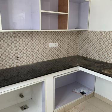 The L-shaped kitchen layout was retained, but the sink was detached from the kitchen and relocated near the washroom.
