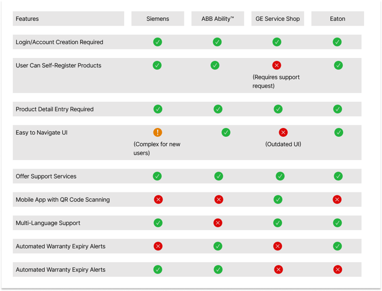 Automation & Alerts: ABB and Eaton provide automated warranty alerts, while Siemens and GE do not. Out product should highlight automation as a key benefit.